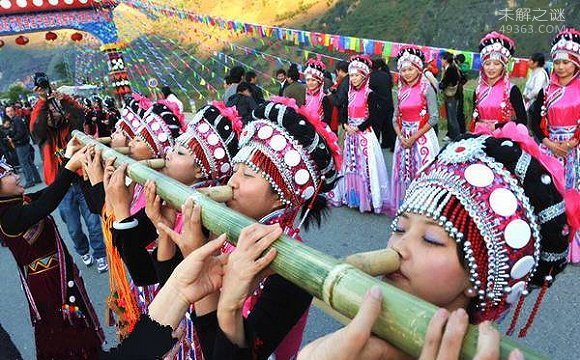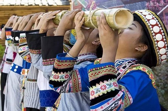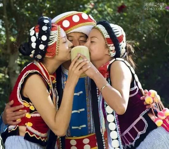 共饮一江水,节日期间,美丽的怒江姑娘用打通竹节的竹竿盛满美酒迎接客人,众人共同举起竹竿喝下迎宾酒,象征着朋友一条心。