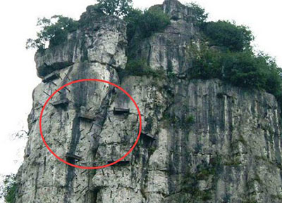 在科技不发达的古代,人们是如何将棺木放置到悬岩上去的呢?有一种说法是:僰人先将悬棺搬上崖顶,或者就在崖顶凿木为棺。然后,将一位熟练的打桩工拴住放到放置悬棺的位置,打好孔、画好岩画,安