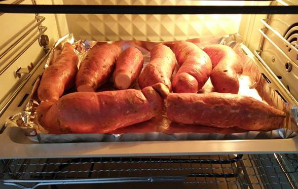 3、把地瓜放在烤箱中,250度烤25分钟,包锡纸的会熟的慢一点,担心没熟的翻面后再烤10分钟。