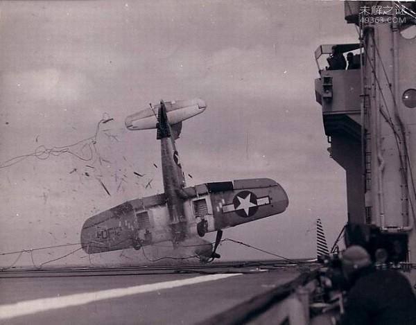 二战期间的太平洋战场,一架F4U海盗式战斗机因制动系统发生故障,坠毁在航空母舰飞行甲板上。