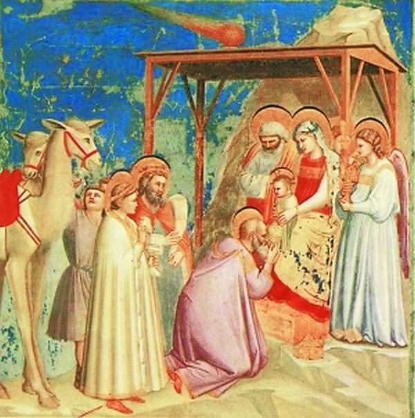 佛罗伦萨大画家乔托大约在1303至1304年间完成的壁画《麦基的礼物》。哈雷彗星曾于1301年出现过一次,这给了这位艺术家创作的灵感,他把伯利恒之星(耶稣出生时当地出现的星星)描绘成了燃烧的流星。